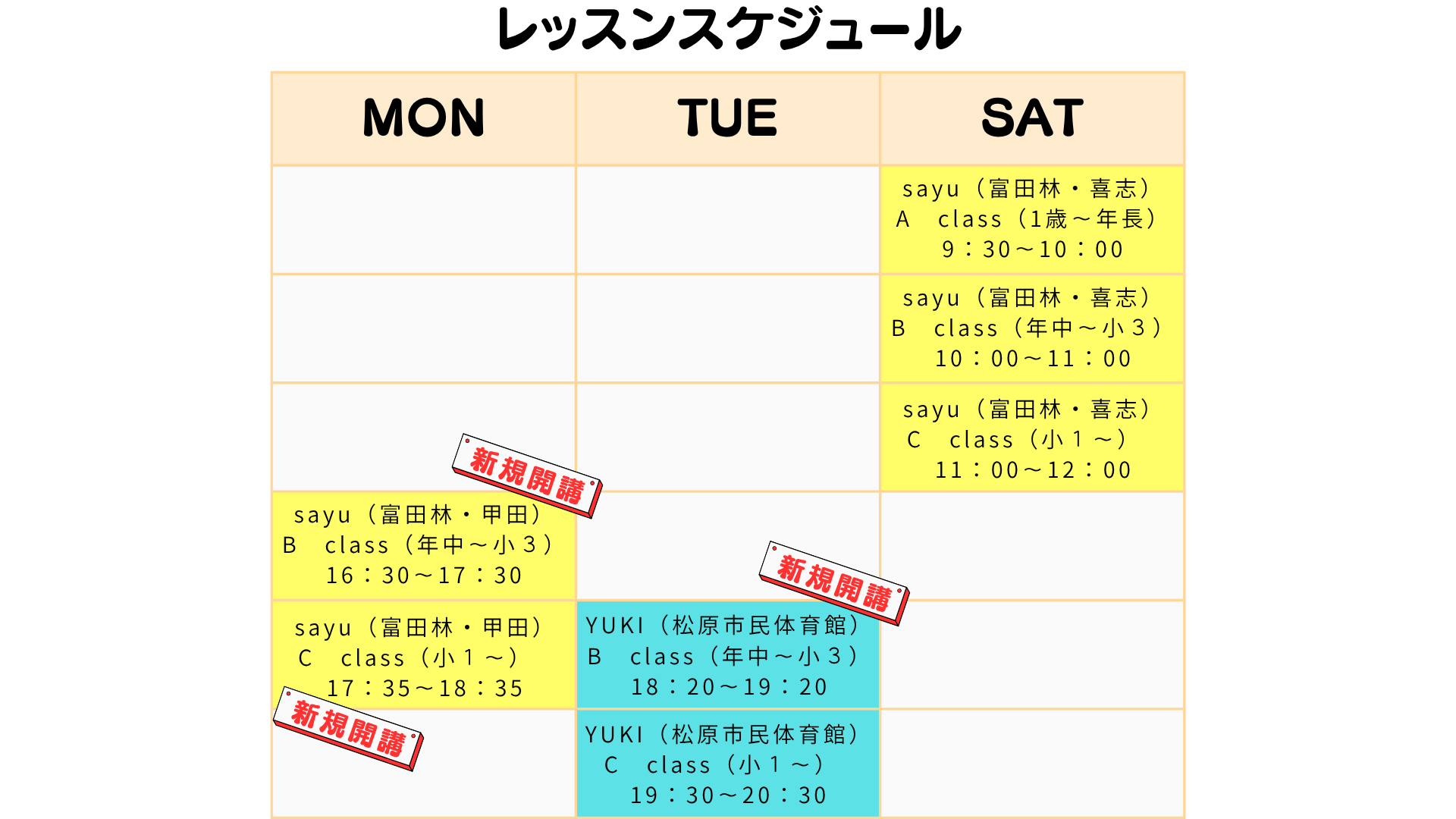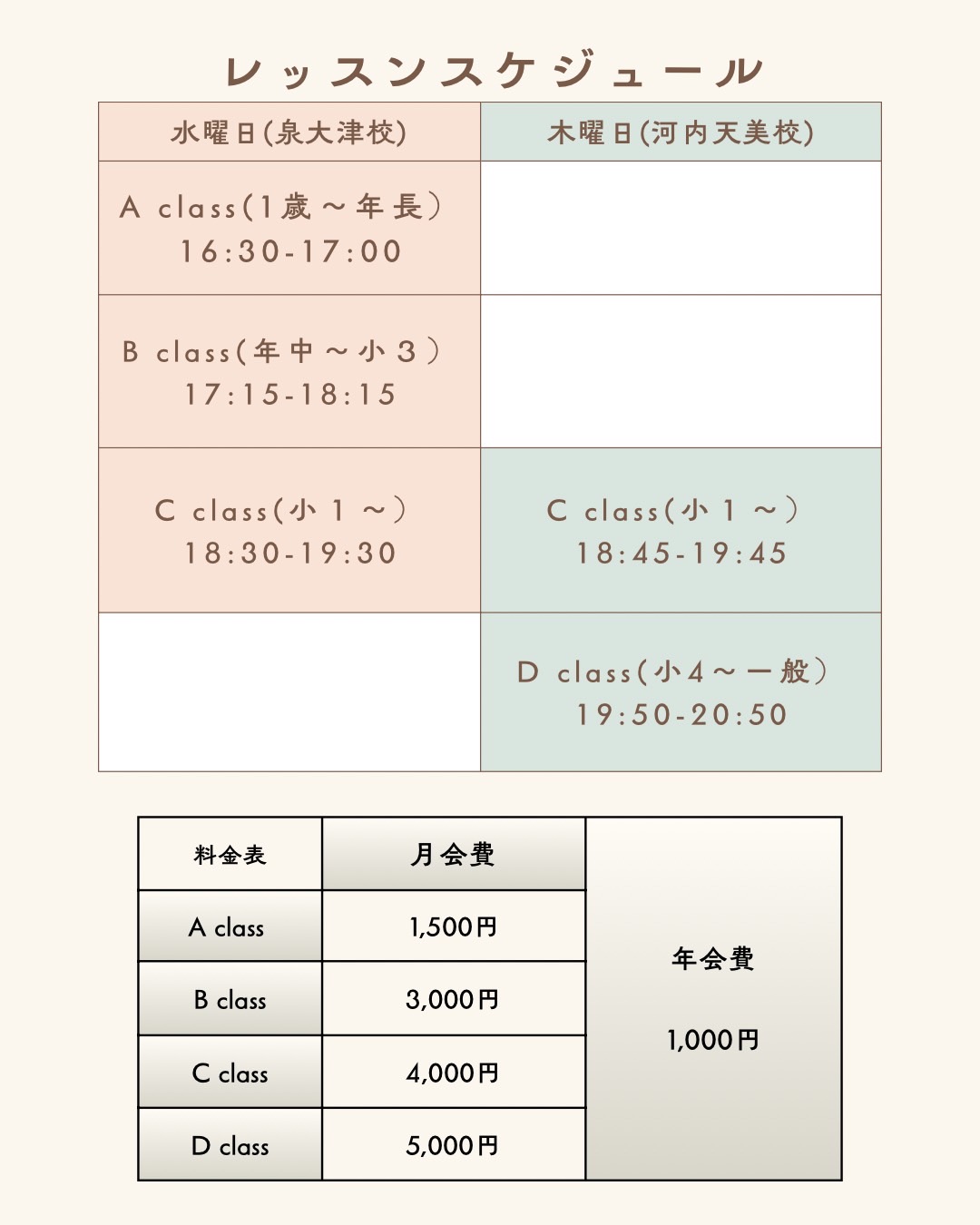 レッスンの有無や講師の変更については、公式LINEやInstagramで随時お知らせしています。最新情報はそちらでご確認ください。